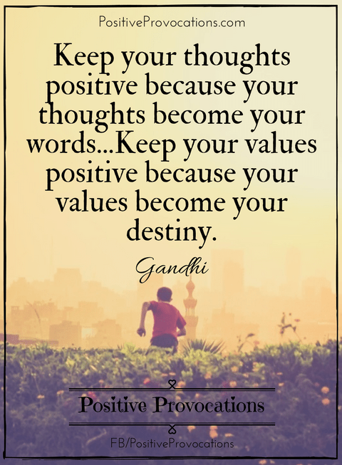 “Keep your thoughts positive because your thoughts become your words. Keep your words positive because your words become your behavior. Keep your behavior positive because your behavior becomes your habits. Keep your habits positive because your habits become your values. Keep your values positive because your values become your destiny.”― Gandhi