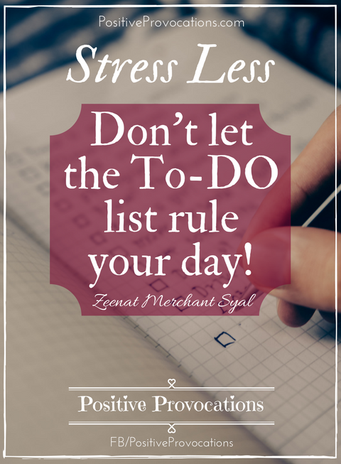 When you have a flexible routine, you don’t stress over the rigidity of a time frame. So try keeping a short to-do list which can be moved around as per your day. Don’t let the To-DO list rule your day! I personally don’t plan for more than ‘today’….I’ve seen people who can have to-do lists the length of a thesis right through the month and they are the ones who live the constantly rush rush-I don’t have time-stress full life. So keep it simple and manage your time positively.